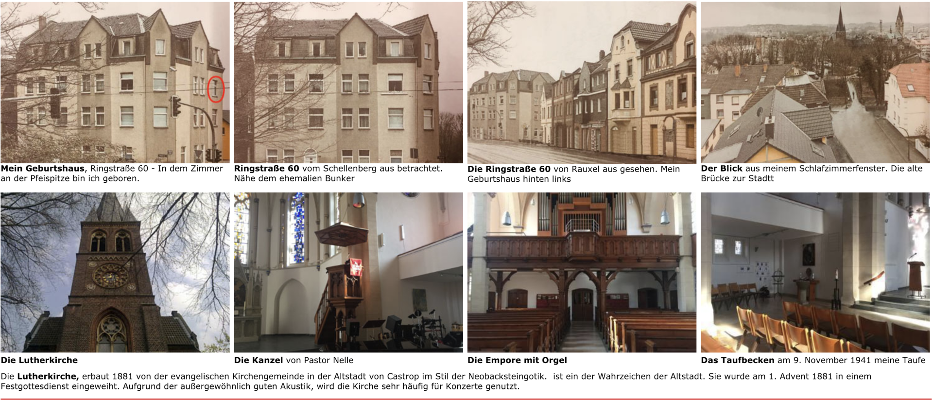 Neben den allgemeinen Bunkern, die als Stollen in Berge getrieben wurden, gab es Hochbunker, auch Turmbunker genannt, die aus hochwertigen und massiven Beton gegossen wurden. Eines dieser Exemplare war 33 Jahre lang (von 1942 bis Mai 1975) ein Wahrzeichen der Stadt. In den 50er Jahren wurden Fenster in den Bunker gesprengt und für 5 Familien Wohnungen hergerichtet. Diese Behelfswohnungen standen Heimatvertrieben zur Verfügung. Es war ein Zufall, dass ich zum Zeitpunkt der Sprengung in Castrop war. Einige Kinder aus Castrop haben die Adresse des Bunkers in ihrem Pass. (Siehe meinen Video-Film über die Sprengung.)